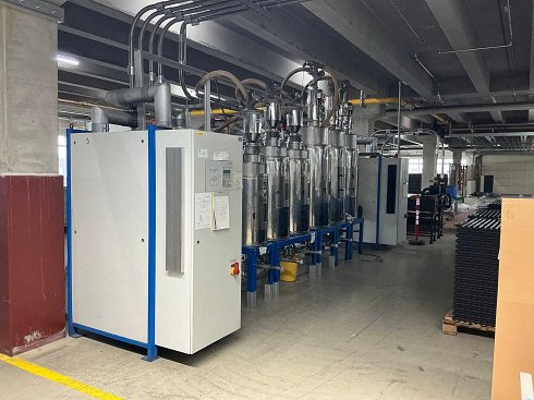 El sistema consta de 2 secadores de aire seco COLORTRONIC CTT 300 (fabricados en 1998/2000), 1 silo de granulados COLORTRONIC TT 100, 2 silos de granulados COLORTRONIC TT200, 3 silos de granulados COLORTRONIC TT400, 2 bombas de vacío BUSCH Mink MM1252AV |