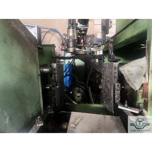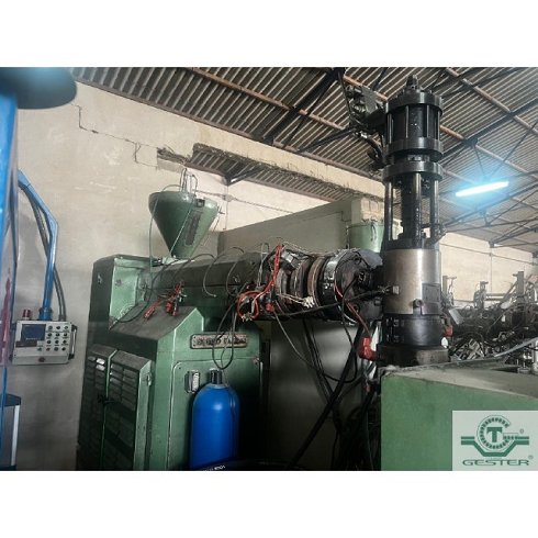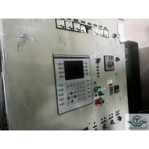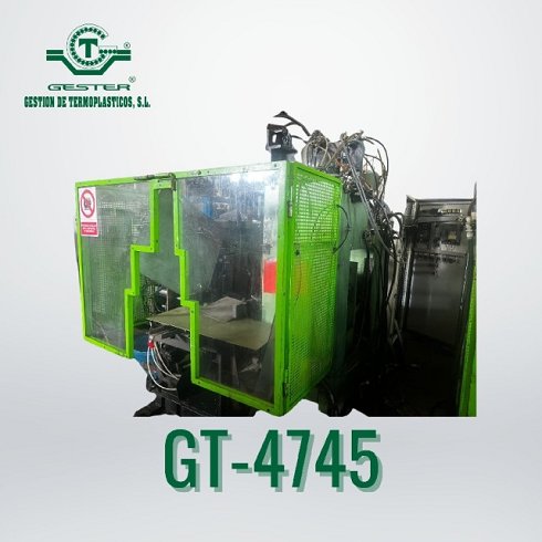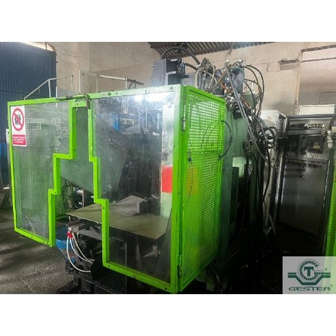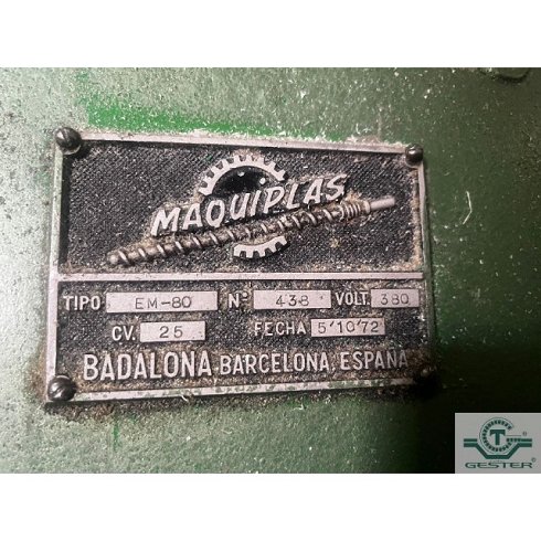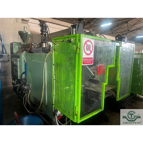 DetallesSopladora Marca: Maquiplast, con extrusora 1 husillo: 80 mm Ø 20 L/D, motor: 30 KW (40 CV) corriente alterna y variador de velocidad, cambiador de filtros hidraulico: 80 mm, cabezal simple para hacer botellas hasta 5 L., cuadro eléctrico con autómata. Carro hidráulico: 15 KW (20 CV) con medidas soporte molde: 400x400x400 mm apertura.