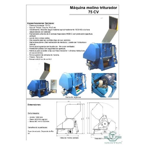 | Detalles | Molino triturador de cuchillas - Marca: Prat - Rotor abierto escalonado con 5 filas de cuchillas en el rotor - Con cuadro eléctrico - Aspirador: 7.5 CV |