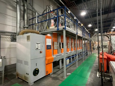 Disposición en estructura de acero que consiste en 8 deshumidificadores Motan con capacidad aprox. 450 litros Calderas de succión de bombas de vacío 2 metro F50 7 unidades de secado Motan LBA600L-0-0 con unidad de succión 1 unidad de secado Motan LBA600L-0-0 con unidad de mezcla de color 1 procesador secador Motan ET 1 estación de distribución con unidad de succión 5 unidades de transporte neumático G 10 l - HSG con capacidad de 10 litros equipadas con imanes Diversos accesorios como mangueras y filtros Busch Mink MM 1252 av Equipado con escaleras y descanso |