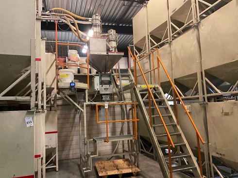 Consiste en andamios con plataforma y escaleras con unidad dosificadora Gravimix, equipada con válvulas dosificadoras accionadas por aire, corredera de descarga y lectura digital terminal. 3 piezas de tolvas Motan y detector de metales Goudsmit |