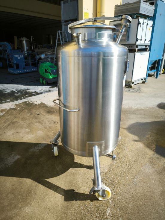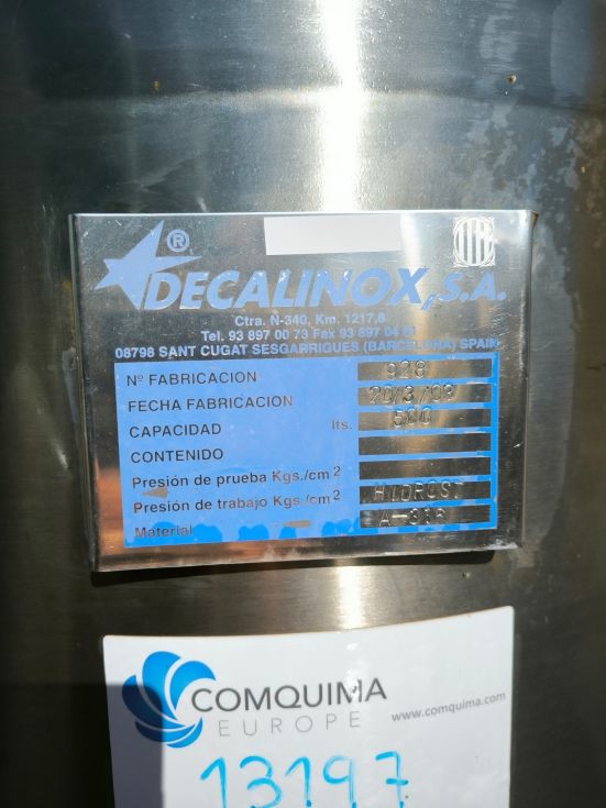 | Detalles | Depósito de segunda mano fabricado por DECALINOX en acero inoxidable 316 con una capacidad de 500 litros. Fondo superior klopper con boca de hombre centrada de 420 mm con tapa abatible. Fondo inferior klopper con descarga por el fondo. Sobre tres ruedas. Conexiones fondo inferior: