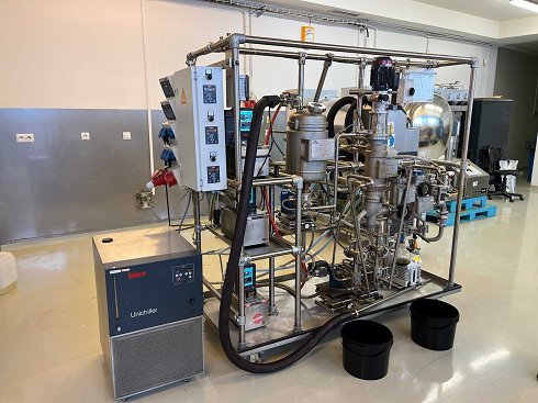 La planta puede utilizarse para: • Desarrollo de procesos • Estudios de viabilidad • Destilación continua de pequeñas cantidades para productos químicos, farmacéuticos y alimentarios sensibles al calor. La presión alcanzable puede ser tan baja como 0,001 mbar en el evaporador de camino corto. Datos técnicos de la unidad de destilación: Tipo de evaporador: VK 100-10 Temperatura máxima de destilación: 300 °C Presión mínima de funcionamiento alcanzable (según el producto ): < 10-3 mbar con paleta rotativa y bomba de vacío de difusión de aceite, Rendimiento: 1 – 10 l/h (según el producto) Superficie de evaporación: 0,10 m² Superficie del condensador interno: 0,15 m² Evaporador de trayectoria corta VK 100-10 Superficie del evaporador: 0,10 m² Condensador interno (conjunto): 0,15 m² Cesta de limpiaparabrisas con transmisión rotativa al vacío: Rotor de bloque SKR Junta de transmisión: Sellado de labios Material de fabricación: 1,4571 (316 Ti) o 1,4404 (316L) Número de