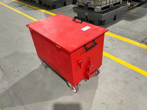 Contenedor industrial fabricado en acero pintado en color rojo, con tapa abatible y asas de transporte laterales. Dispone de cuatro ruedas para facilitar su desplazamiento y un sistema frontal de enganche.