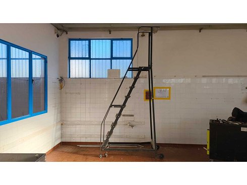 Escaleras nº 2 con plataforma, equipadas con: ruedas, pasamanos y barandilla superior de seguridad.