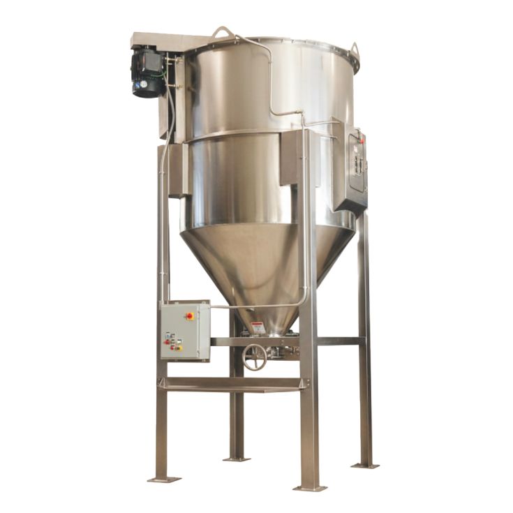 El Mezclador Vertical o "Vertical Mixer" es un equipo industrial diseñado para mezclar materiales, generalmente en polvo, granulados, pellets o ingredientes secos. Otro de sus usos es bajar o subir la temperatura a los productos. Sus características de diseño le confieren un alto rendimiento, siendo un equipo muy versátil para adaptarse a las necesidades de cada cliente. Pueden fabricarse en diferentes diámetros y alturas, según petición y requerimientos de producción.