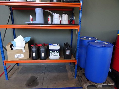 compuesta por varios bidones de 20L con inscripciones diésel, gasolina, Futtera AS15, 1 barril de 200L Veidec Duo Clean Bulk 17 y 1 cañón de 200L desconocido, con bandeja de goteo de plástico |
