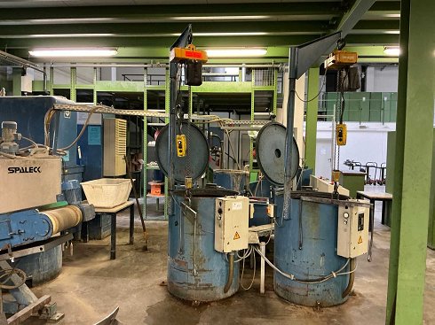Diámetro del tambor 600 mm, carga máxima 130 kg, grosor de pared 3 mm, material ST37, carga 12 h, calefacción 12 kW, incluyendo polipastos y segundo tambor