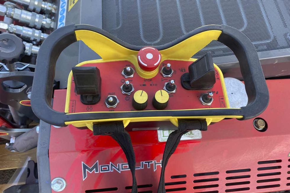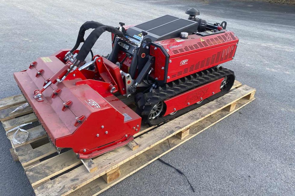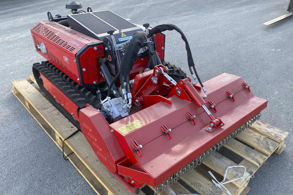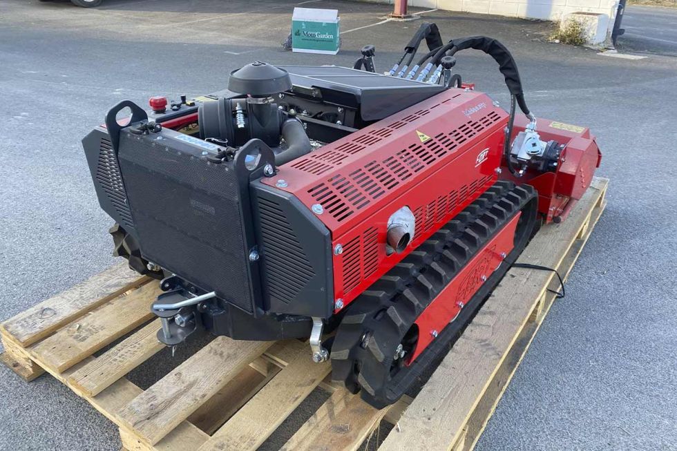 Máquina teledirigida para trabajos de dificil acceso, admite pendientes hasta el 50%, equipado con una picadora de hierbas pero con posibilidad de otros accesorios. con un peso de 430 kg y motor briggs & stratton de 2 cilindros y 23 cv permite trabajar al operario ahasta 150 mts de distancia.