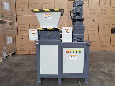 Trituradora de doble eje, fuente de alimentación de 380 voltios, ideal para plástico, madera, astillas de hierro, papel. Boca de carga 620 x 570 mm, área de trabajo 350 x 300 mm, nunca utilizada 0 horas