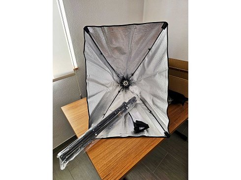 Cada juego incluye todos los componentes necesarios para una instalación sencilla y un transporte cómodo, incluyendo una softbox de 50x70 cm con tela difusora de alta calidad, un soporte ajustable para lámpara y una bolsa robusta. Las softboxes cuentan con un recubrimiento interior reflectante plateado y un difusor exterior blanco, como se muestra en las imágenes. Todos los productos son nuevos, en su embalaje original y listos para su uso inmediato.