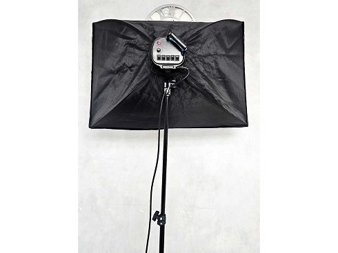 Softbox: caja reflectante de 50x70 cm para una distribución uniforme y suave de la luz.