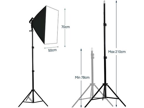 Softbox: caja reflectante de 50x70 cm para una distribución uniforme y suave de la luz.