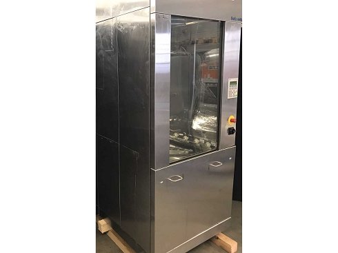 Se trata de una lavadora fija de carga frontal diseñada específicamente para el lavado en el laboratorio Utensilios y cristalería, etc. La máquina está completamente construida en acero inoxidable y está instalada con una puerta corredera vertical delante. Tiene dimensiones internas de 110 x 60 x 75 cm y es útil volumen de aprox. 500 litros. Los objetos a lavar se colocan en cestas que a su vez son colocado en un carrito. El tranvía se enrolla hasta la puerta abierta de La lavadora. Esta arandela está actualmente equipada con 3 diferentes cestas. El conjunto de lavado consta de dos conjuntos giratorios Lavar brazos en la parte superior y en la parte inferior que guían diferentes detergentes y medios para enjuagar en la máquina. El depósito de detergentes se encuentra en la base de la máquina. El Belimed PH 820 ofrece diferentes programas de lavado con Temperaturas variables de lavado y tiene una capacidad calefactora de 19,7 kW. Todos los controles del operador están agrupados en un