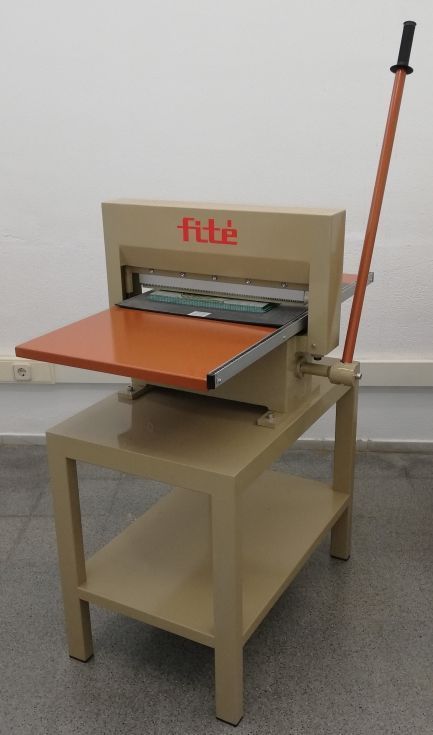 | Detalles | Guillotina cortadora de muestras textiles en zig-zag. Longitud de la cuchilla 50 cm. Cuchilla nueva. Accionamiento rápido mediante palanca manual. Máquina completa con zócalo soporte, prensamuestras automático y escuadra lateral graduada en mm. |