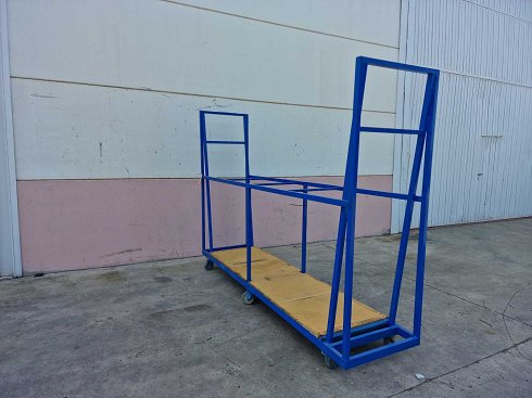 - 4 x carros: dimensiones totales 3000 x 700 x 2150 mm cada uno, 2 niveles de carga de dimensiones útiles aprox. 2700 x 700 x 850 mm en la parte superior y 2600 x 700 x 950 mm en la parte inferior, 6 ruedas giratorias