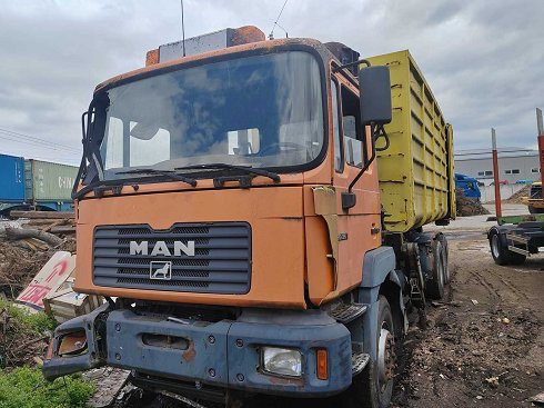 HOMBRE – Camión elevador con gancho y grúa cargadora de troncos sin contenedor Datos generales: Fabricante: HOMBRE Modelo: Desconocido Tipo de máquina: Camión elevador con gancho y grúa cargadora Año de fabricación: Desconocido Condición: Usada Peso: aprox. 18000 kg Dimensiones (L x Anor x Ar): aprox. 8000 x 2500 x 3500 mm Equipamiento: Sistema de elevación con gancho: Palfinger Palift PLT-18 (año 2000) Grúa cargadora: Jonsered 100 Z (año 1997, manuf. nº 488, aprobación H1/B4) Sistema hidráulico con controles del operador Cuerpo basculante integrado Descripción: Camión industrial polivalente equipado con sistema de gancho y grúa forestal cargadora. Diseñado para la manipulación de contenedores, transporte de residuos, operaciones de biomasa y carga de madera/troncos. La combinación del gancho Palfinger y la grúa Jonsered permite operaciones flexibles de carga, descarga y transporte. Notas de condición: Desgaste y corrosión visibles.