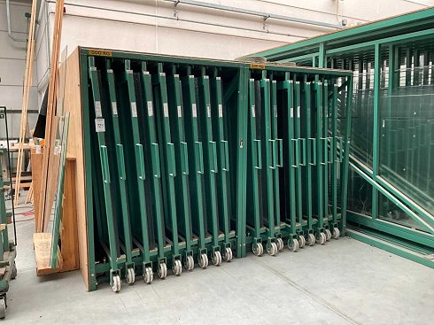 Equipado con: (18x) corredera de vidrio, capacidad por corredera: 500 kg, altura máxima: 1700 mm, longitud máxima 3000 mm, con contenido de culata de vidrio |