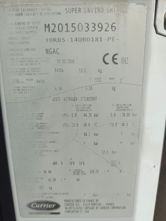 | Detalles | Carrier enfriadora de agua Modelo:30RBS-140B0181-ME, año 2016, R410A |
