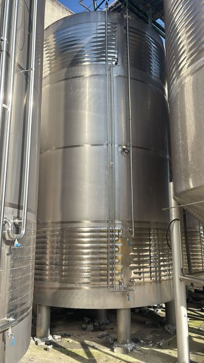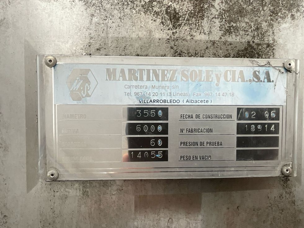 | Detalles | Dos depósitos de elaboración de 60.000 litros en inoxidable con camisa de frío arriba y abajo del cuerpo. Fondo plano inclinado. Boca de hombre en la parte inferior del cuerpo. Control de nivel visual exterior. Montados sobre patas. 3550mm de diámetro x 6000mm de alto. En perfecto estado. |