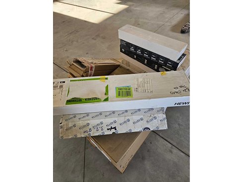 1 palé con varios artículos. grifo, dispensador de toallas, ducha y bañera, pasamanos negros, cubo de basura empotrado |